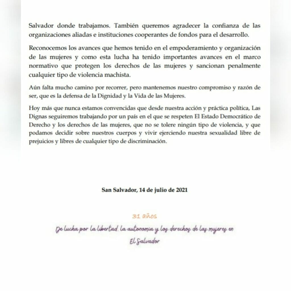 Comunicado 31 Aniversario Las Dignas por Las Dignas El Salvador | Jul 15, 2021 | COMUNICADO, GENERAL, NOTICIA | 0 Comentarios Enviar comentario Cancelar la respuestaTu dirección de correo electrónico no será publicada. Los campos obligatorios están marcados con *Comentario * Nombre * Correo electrónico * Web Guarda mi nombre, correo electrónico y web en este navegador para la próxima vez que comente. Δ