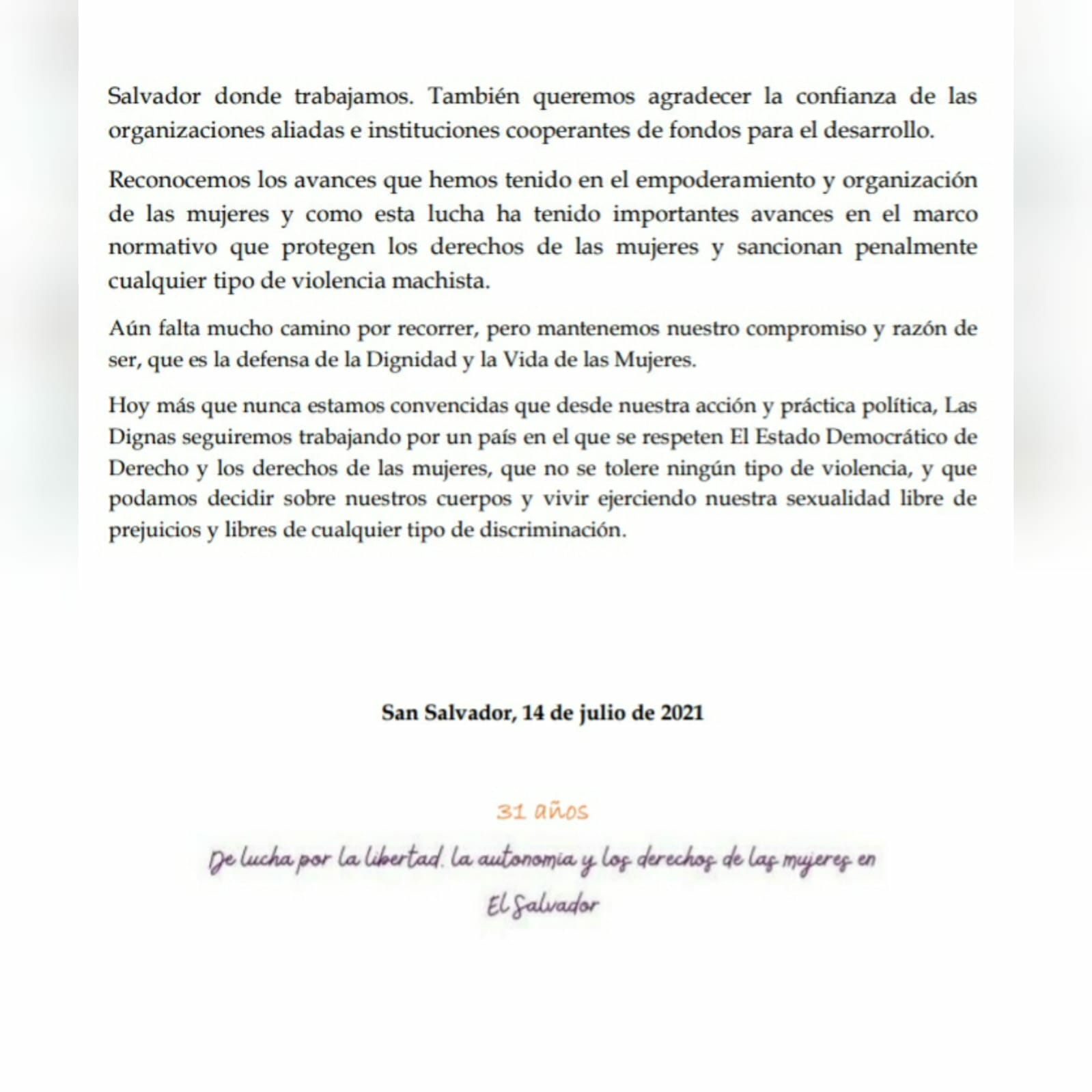 COMUNICADO-31ANOS-III por Las Dignas El Salvador | Jul 15, 2021 | 0 Comentarios Enviar comentario Cancelar la respuestaTu dirección de correo electrónico no será publicada. Los campos obligatorios están marcados con *Comentario * Nombre * Correo electrónico * Web Guarda mi nombre, correo electrónico y web en este navegador para la próxima vez que comente. Δ